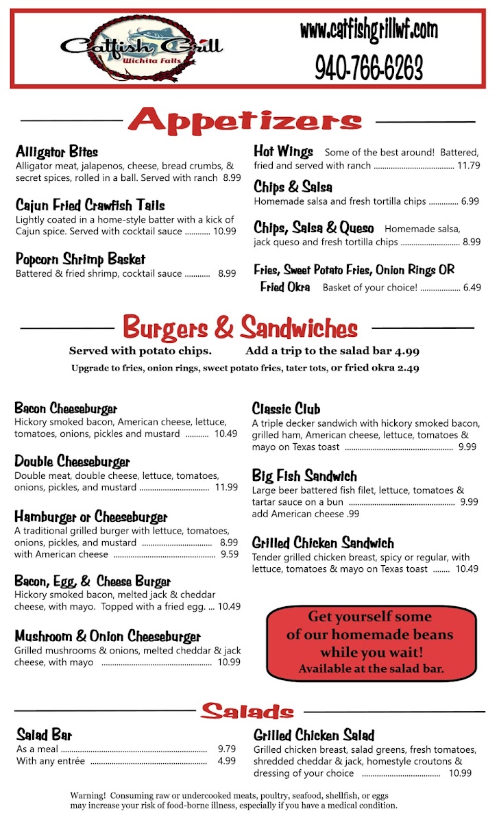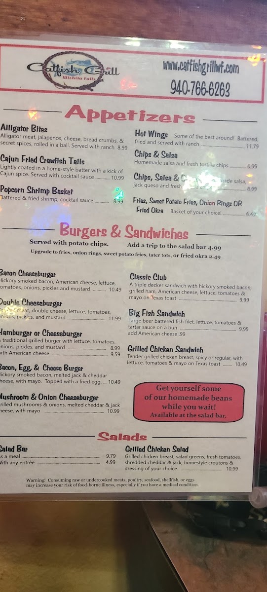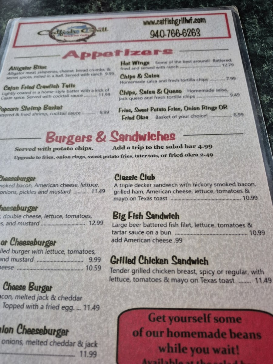 Welcome to Catfish Grill, located at 1505 Southwest Pkwy in Wichita Falls, Texas. This charming eatery invites you in with a warm, homey atmosphere that feels like gathering on a back porch with friends and family.